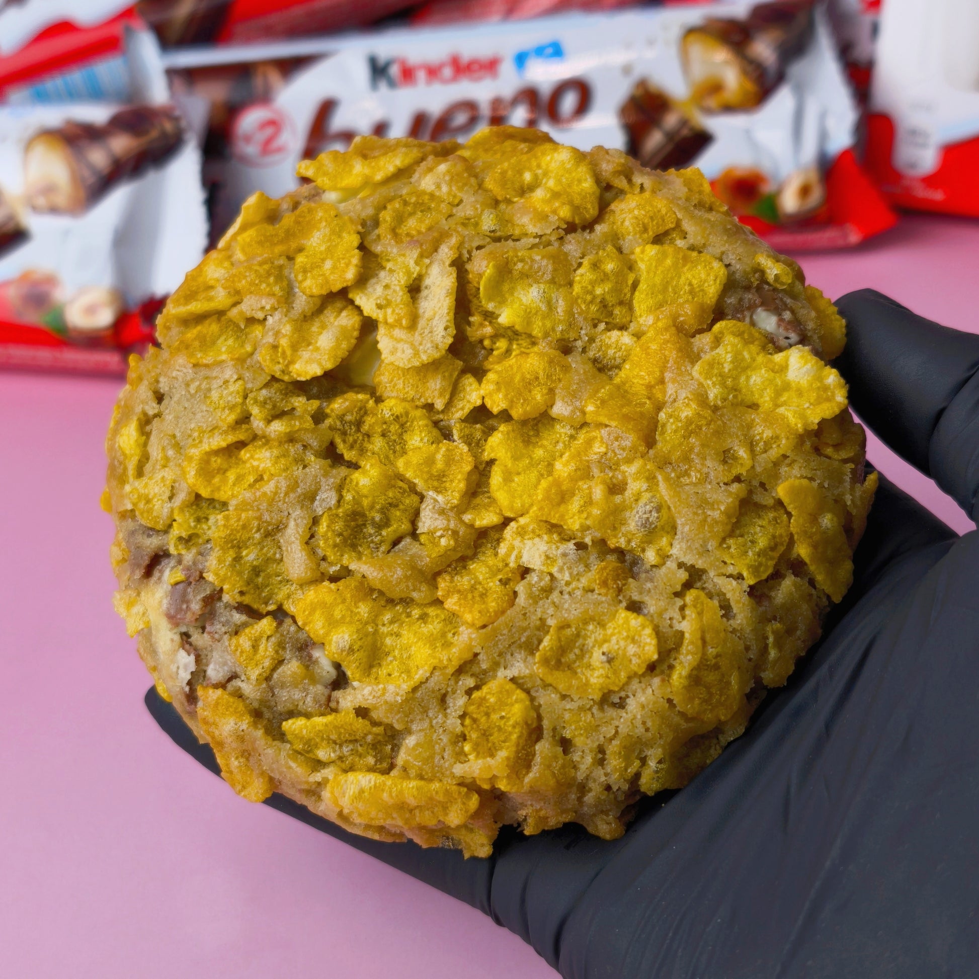 Tirpstantis burnoje sausainis, kupinas tikro Kinder šokolado gabalėlių, o jo viduje slepiasi gausus sluoksnis kreminio Bueno įdaro - tiek daug, kad kiekvienas kąsnis tampa mažyte laime. Išorėje - traškūs kukurūzų dribsniai, suteikiantys tobulą kontrastą švelniam vidui.