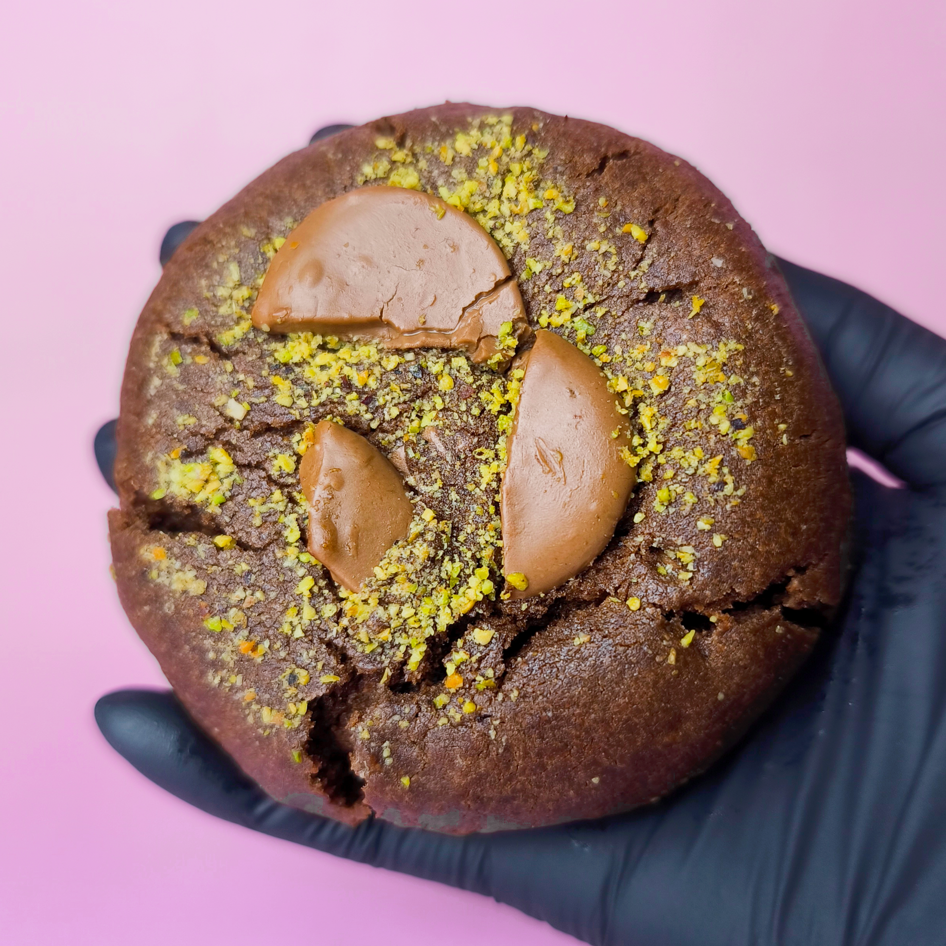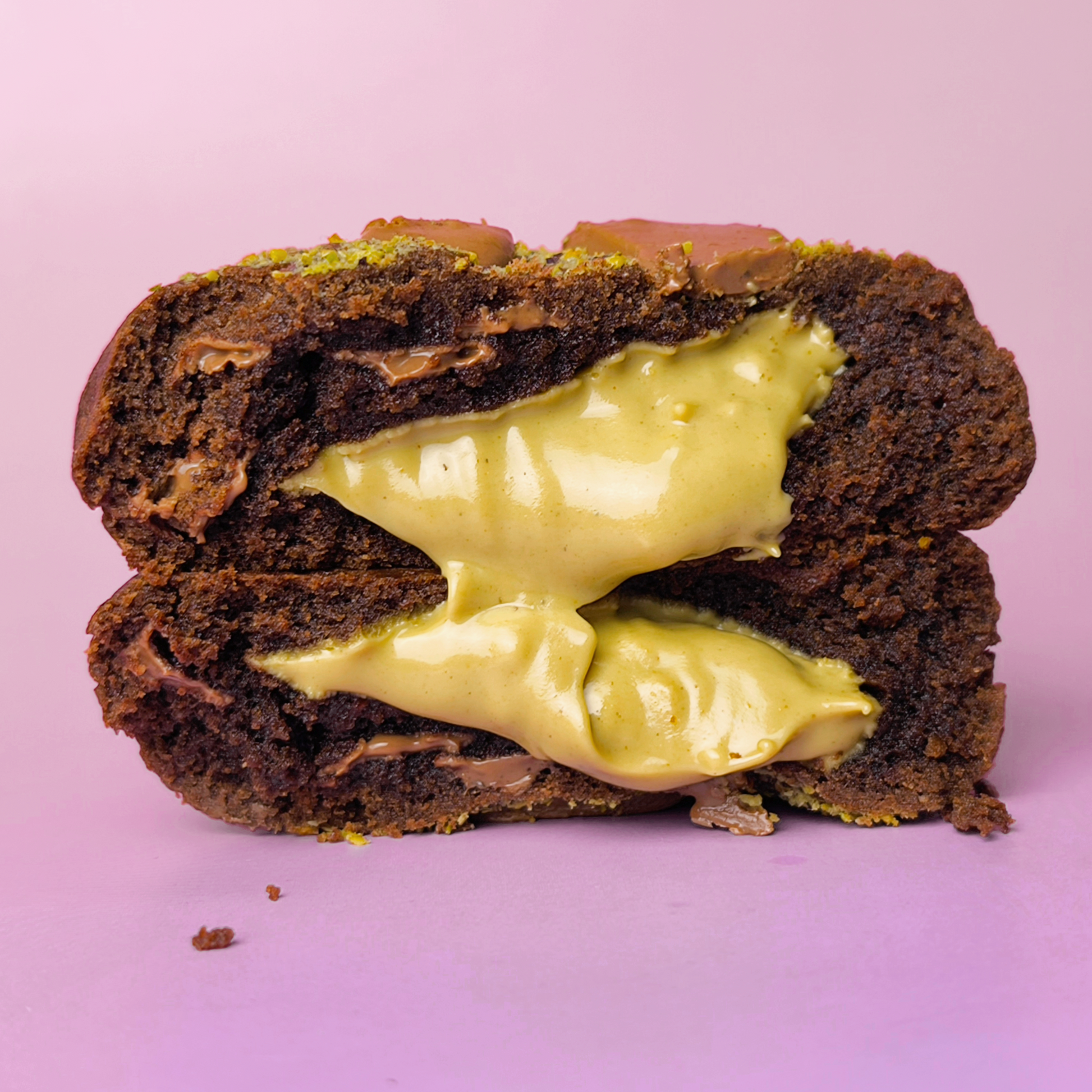 Sodrus kakavinis sausainis su gausiais belgiško pieniško šokolado gabalėliais, o pačiame centre slepiasi dosnus sluoksnis kvapnaus pistacijų kremo - toks tirštas ir aromatingas, kad kiekvienas kąsnis tampa tikru malonumu. Išorėje juntamas intensyvus šokolado skonis, o viduje - švelni, riešutinė pistacijų bomba, sukurianti tobulą derinį.